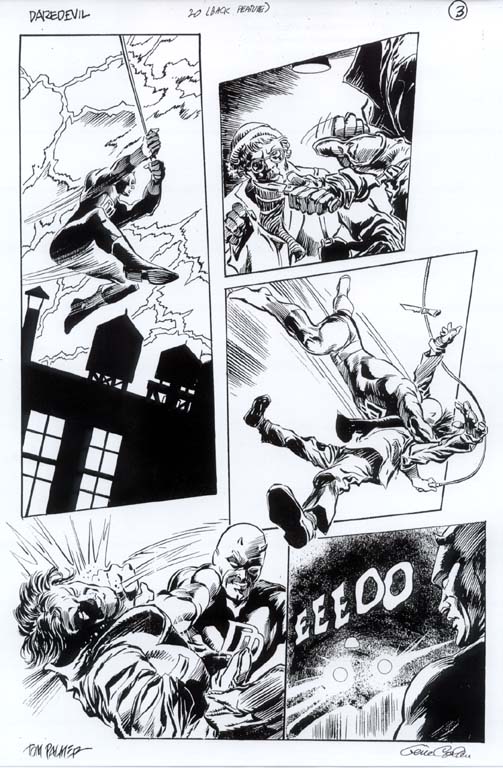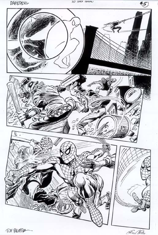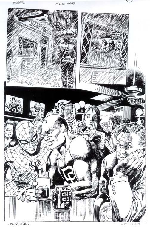 This is probably the point where any sane fan (is that an oxymoron?) would have thrown in the gloves. In fact, the 35th anniversary had passed, so what reason would there even be for a "special" issue? Well...Daredevil was just 15 short issues away from another milestone: its 400th issue. I'd even sketched out rough plots in my head for all four teams on the special, although I wouldn't have even pretended to have the chutzpah to try and make suggestions to any of those folks. In the words of Wayne and Garth: I wasn't worthy. At the same time, I wasn't ready to completely give up on the idea either. Besides, I still had one more ace up my sleeve. I met Gene and Adrienne Colan two years previously at an appearance at my local comic book shop. I'd put together a website for Gene and had already bartered with him for a couple of neat drawings. I was thinking of bartering with Gene for something really cool in a Daredevil vein, and I decided to go all out and see if he'd consider a short story with the understanding that I might get it published some day. He was open to the idea, so then I had to decide what to send him: script or synopsis. I still had this pipe dream of getting Stan Lee to do the dialog at some point, and I knew that Gene likes working without a lot of restrictions, so I sent off a couple paragraph plot a la the Marvel method and put my trust in the Dean. (My trust was very well placed as you will see.)