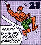 ![]() For a number of years, the back cover of Marvel Age featured a "calendar" with gags/jokes, announcements of birthdays, and all sorts of assorted cartoons. Daredevil "appeared" in a number of these. And while they're mostly just 1 frame cartoon cameos rather than actual parodies, they share a certain flavor with the Bullpen Bits. |